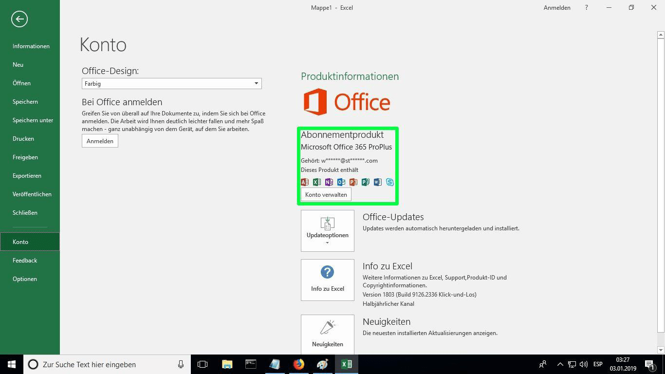 • In order to verify that the product activation has been carried out, you can open any Microsoft Office package such as Excel and go to File-> Account ”. You will see the Microsoft account associated with the product.