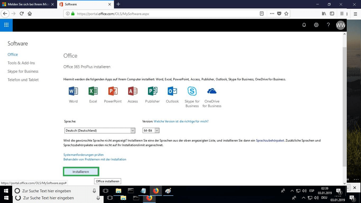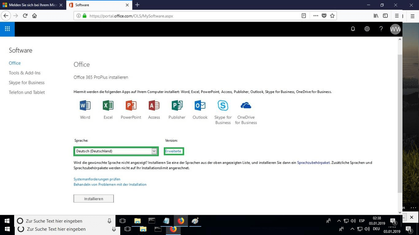 Select the language of your preference from the drop-down menu marked “language”. The product will be installed by default in the 32-bit version. If you want to install the 64-bit version click on the “advanced” option.
